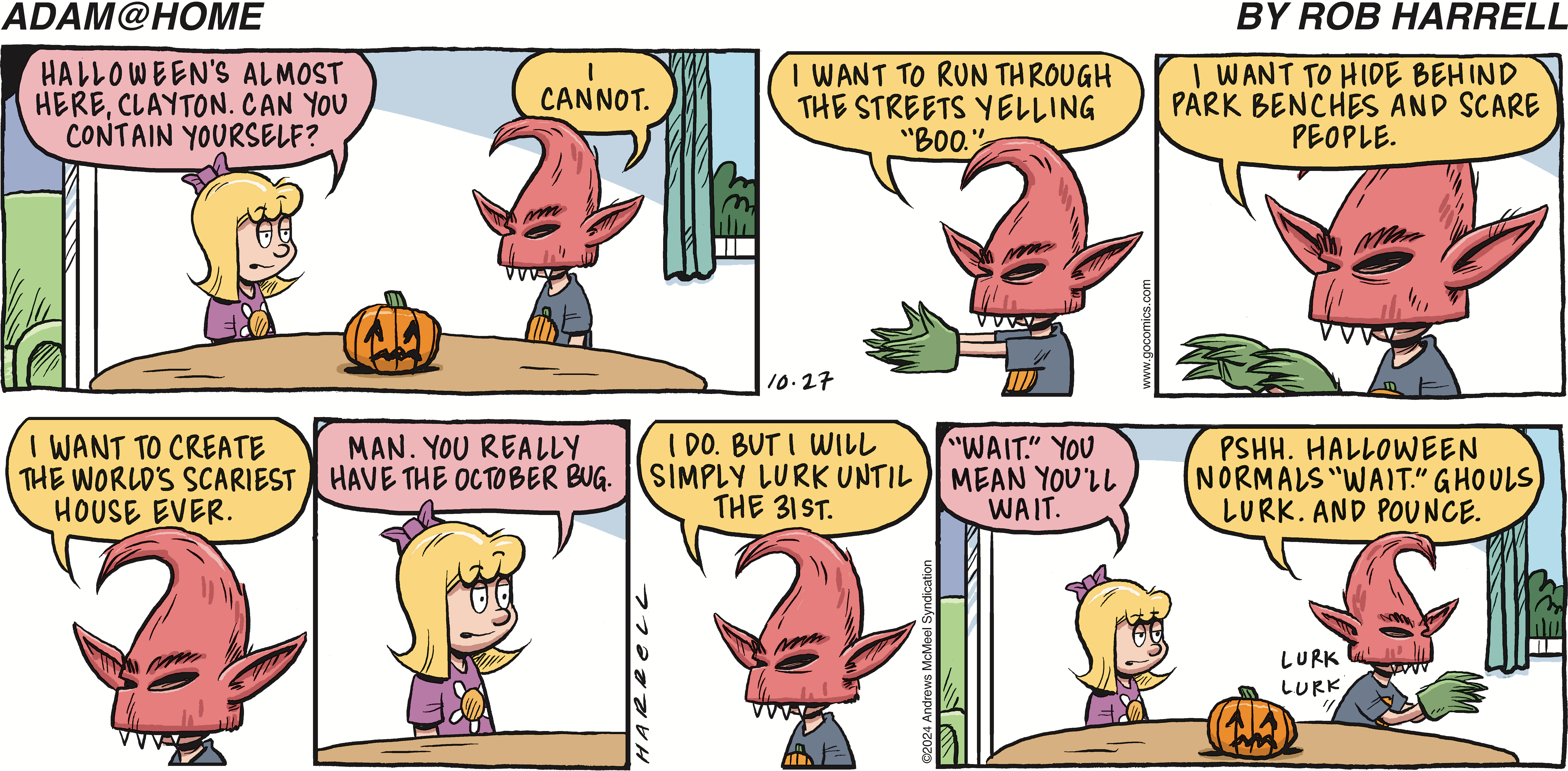 Rob Harrell writes and draws the daily comic strip "Adam@Home" and also created the fan-favorite strip "Big Top." He is the author of several books, including the acclaimed middle-grade novels "Wink" and "Popcorn," the "Life of Zarf" series, and the graphic novel "Monster on the Hill," which was adapted into the animated film "Rumble." In addition, Harrell writes and illustrates the "Batpig" graphic novel series, which so far includes "When Pigs Fly," "Too Pig to Fail" and "Go Pig or Go Home." He lives in Zionsville, Indiana, with his dog, Shepler.