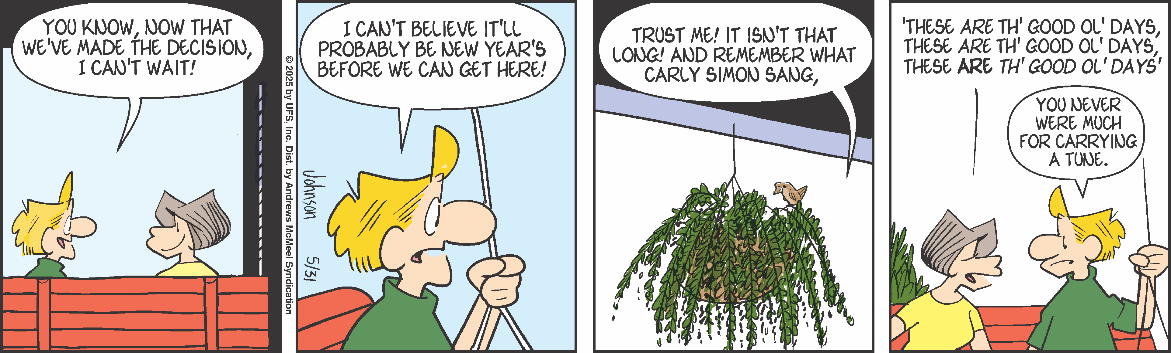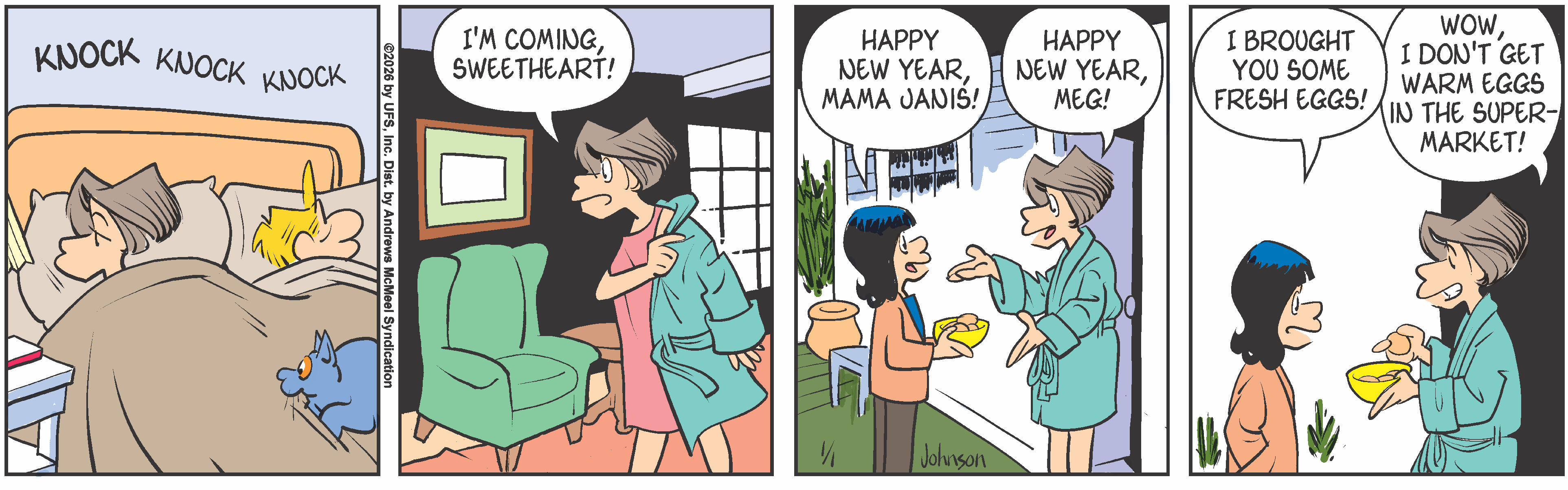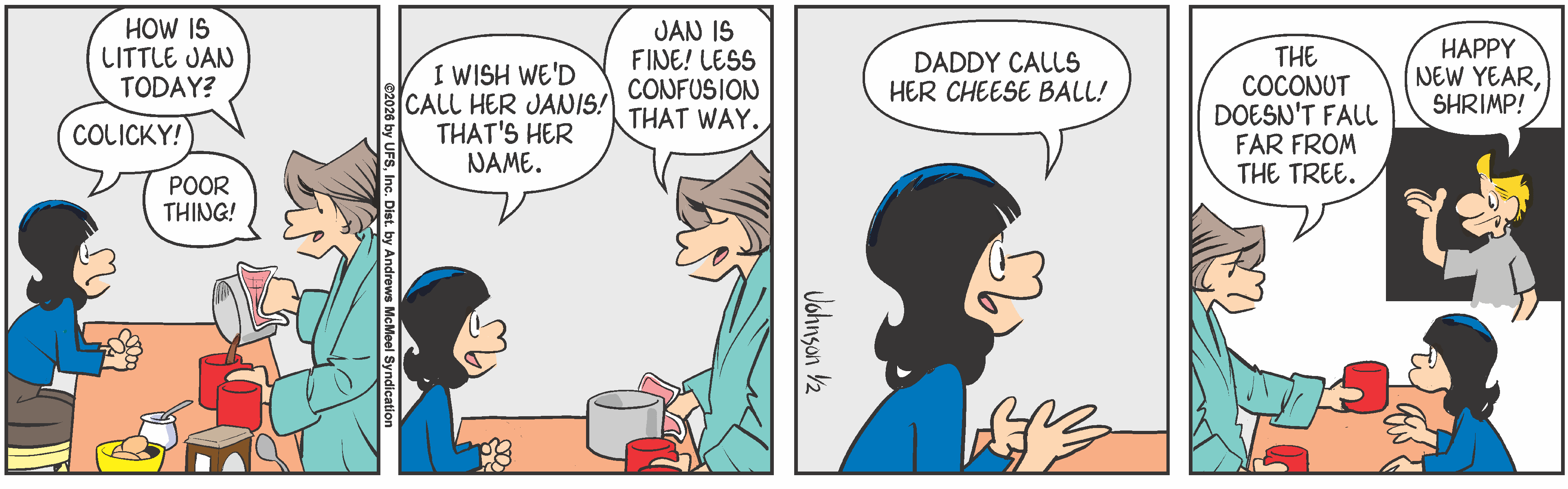 From the ugly sofa that is the center of the "Arlo and Janis" universe, this shapeshifting comic strip has been just about everywhere, from unvarnished human drama and flights of unfettered comic fantasy to unabashed pathos and pithy observational wit. The characters, Arlo and Janis, have played the parts of mermaids, squirrels, alligators, and grasshoppers over the years, all while exploring the unexaggerated human condition and managing to become one of the most believable families in the funny pages. This unique approach has garnered "Arlo and Janis" an intelligent and engaged readership and guaranteed that a percentage of that readership will be confused and disgruntled at any given moment.