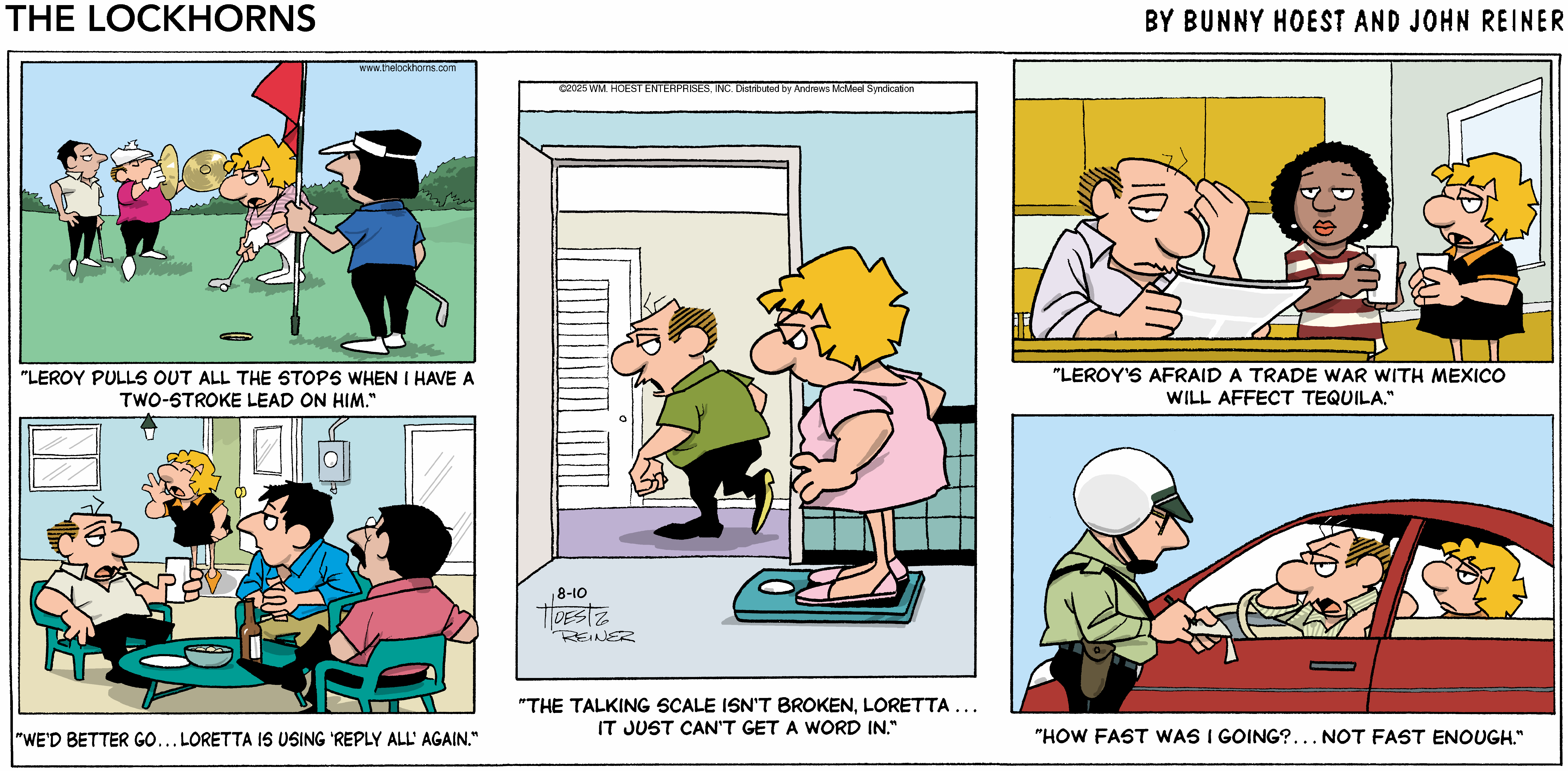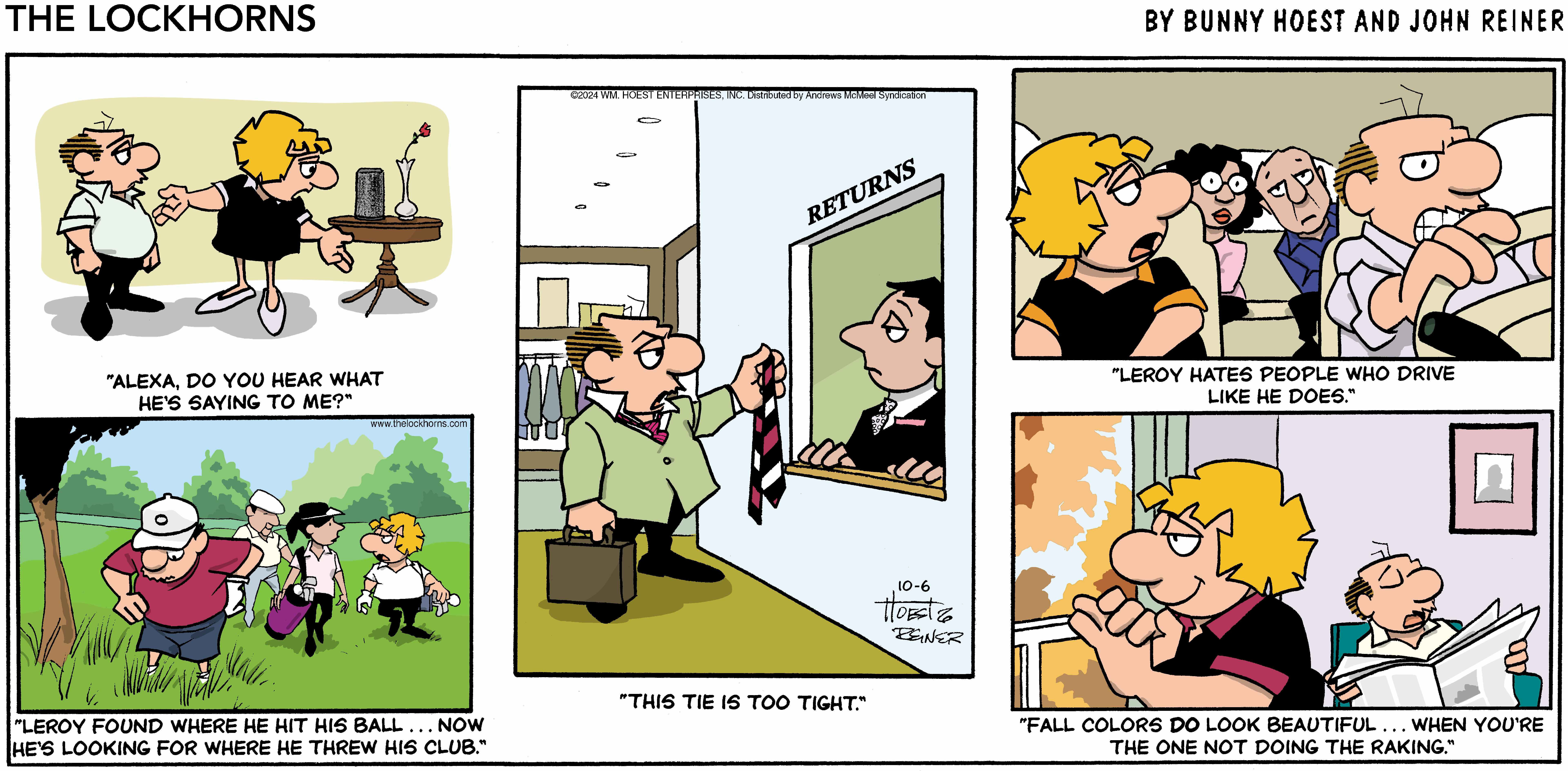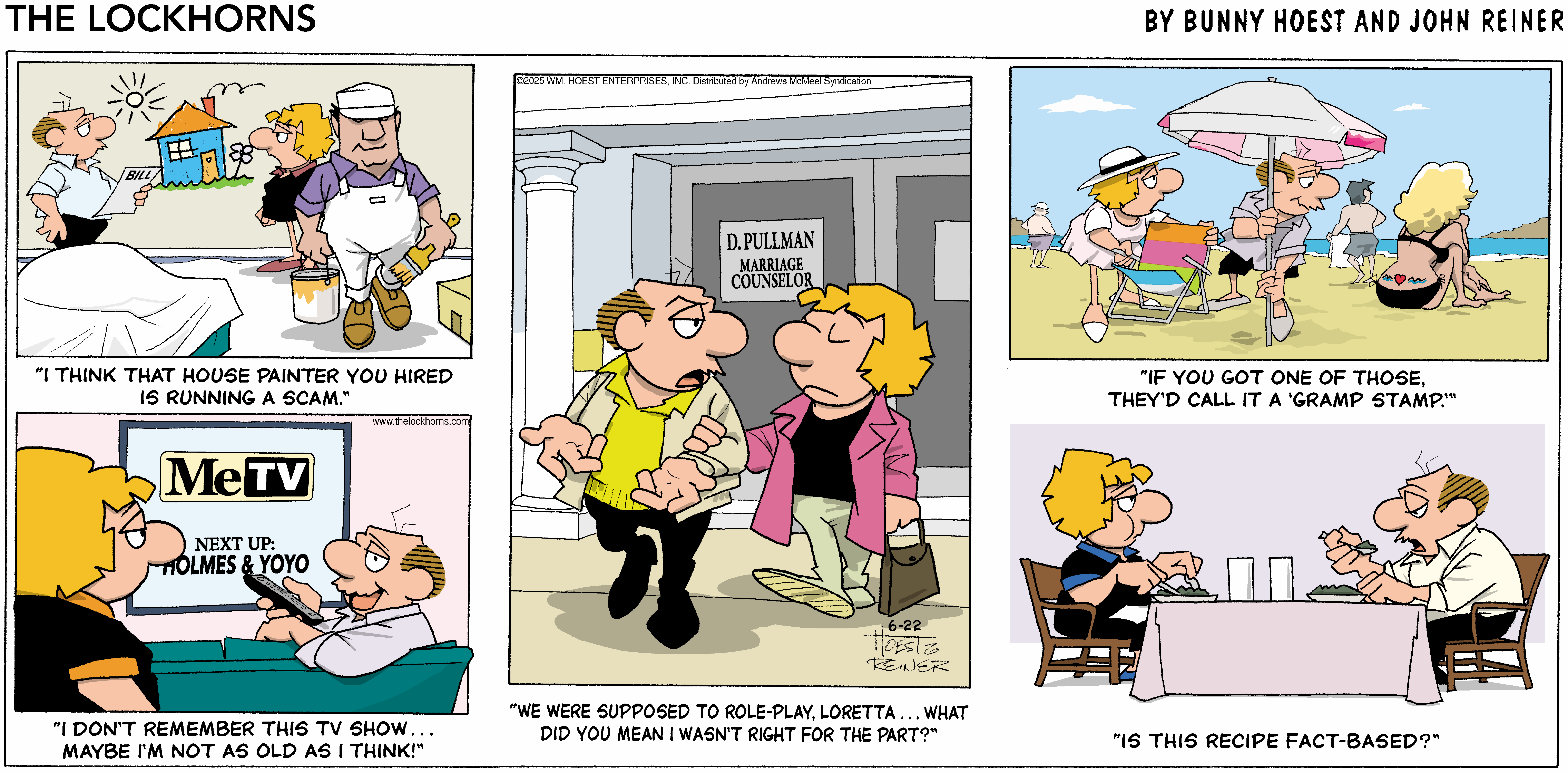 "The Lockhorns" gently pokes fun at any two people living together in committed partnerships through the antics of married couple Loretta and Leroy Lockhorn. The panel displays the foibles of both partners; their snappy repartee and witty banter belies the couple’s deep love and commitment to one another. Readers recognize the dialogue and illustrations as a window into their own lives or the lives of their family and friends. No matter what problems come their way, through couples counseling and trips to the bar (for Leroy), Loretta and Leroy realize that they’re together “’til death do us part.”