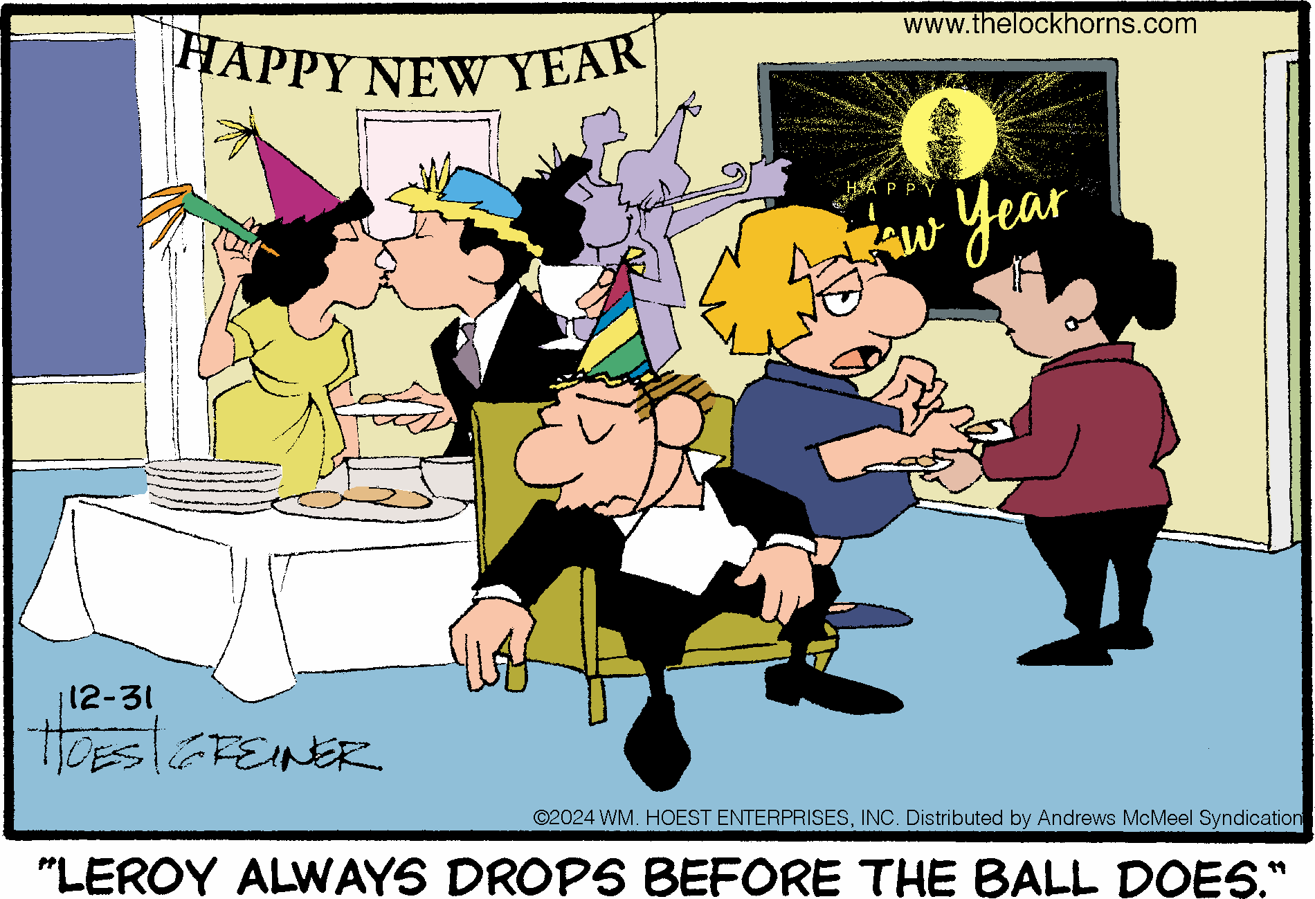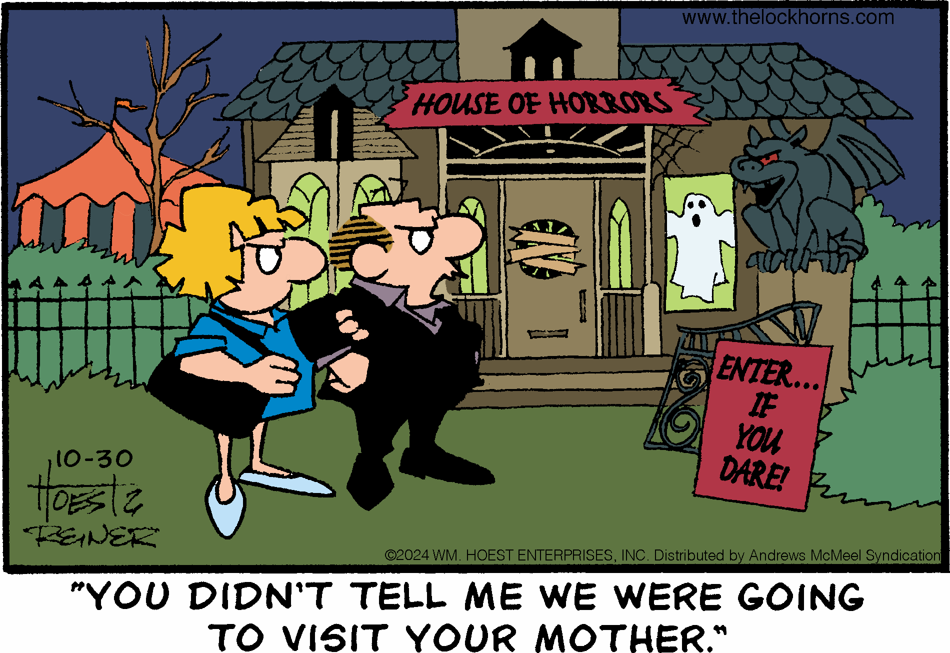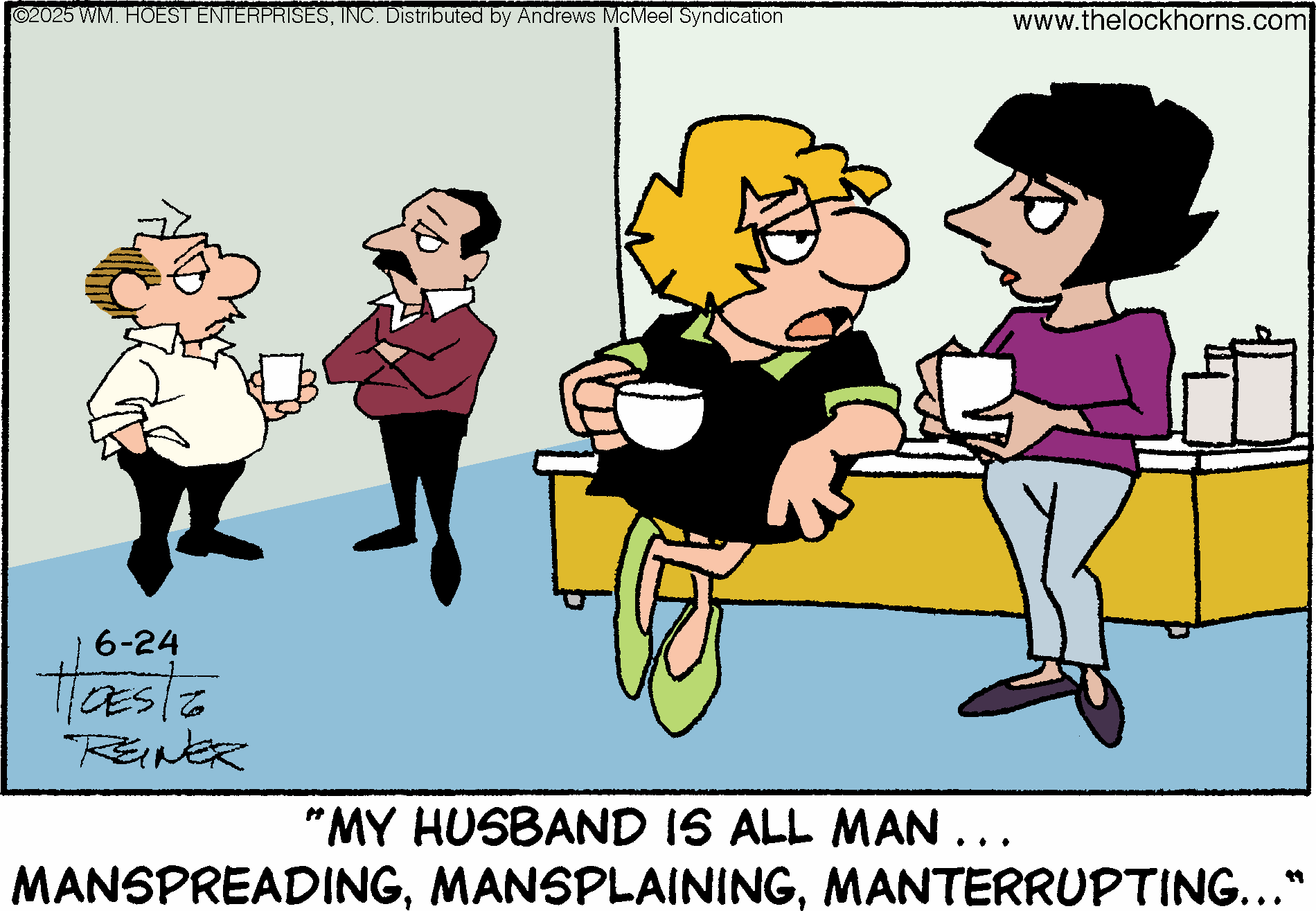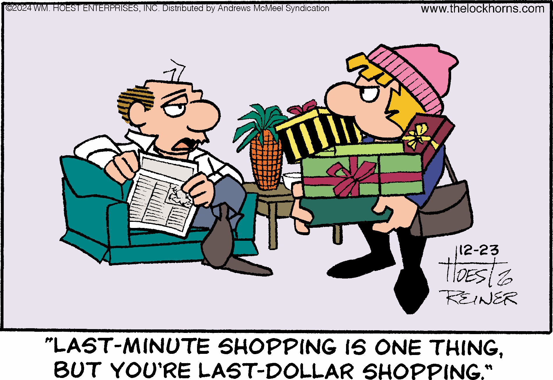 "The Lockhorns" gently pokes fun at any two people living together in committed partnerships through the antics of married couple Loretta and Leroy Lockhorn. The panel displays the foibles of both partners; their snappy repartee and witty banter belies the couple’s deep love and commitment to one another. Readers recognize the dialogue and illustrations as a window into their own lives or the lives of their family and friends. No matter what problems come their way, through couples counseling and trips to the bar (for Leroy), Loretta and Leroy realize that they’re together “’til death do us part.”