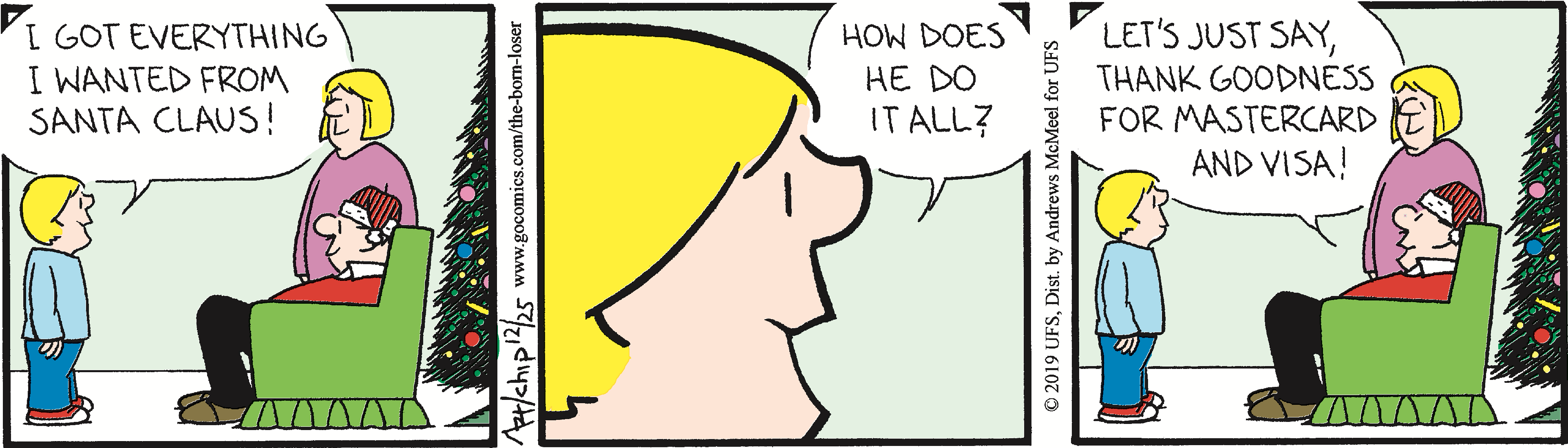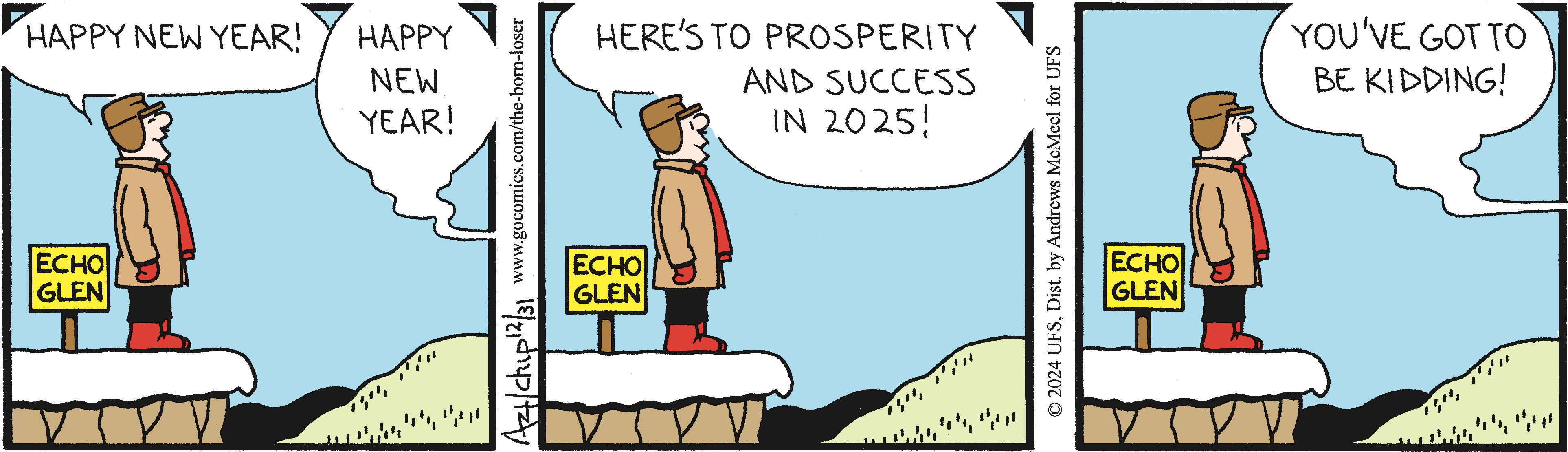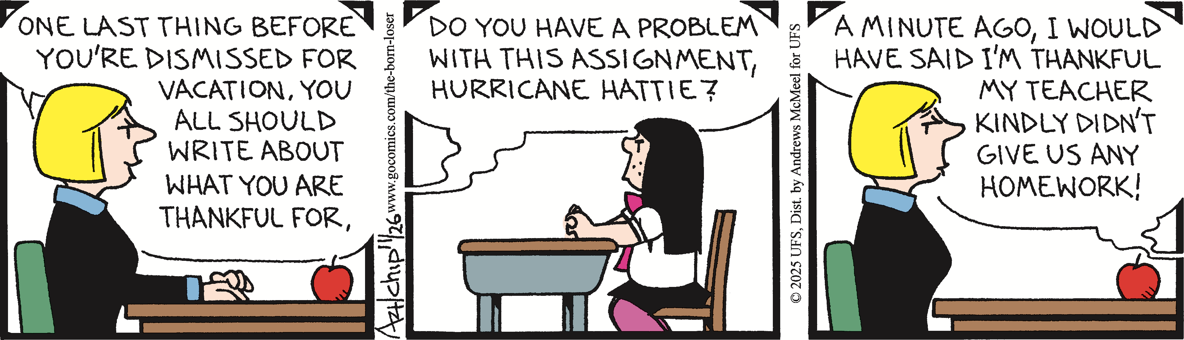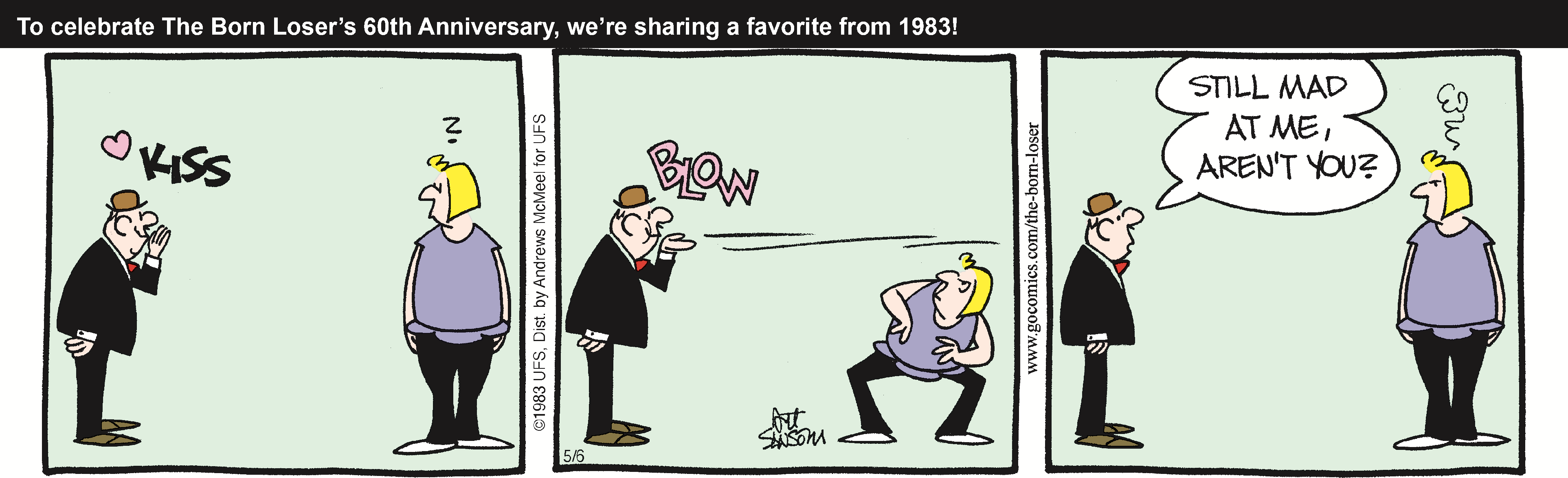 "The Born Loser" began in 1965 as a strip with no central characters that revolved around the loser theme. Gradually, it developed into the comic we see today, starring lovable loser Brutus Thornapple, his wife Gladys, mother-in-law Ramona Gargle, boss Rancid Veeblefester, dim-witted son Wilberforce, and the mischievous neighbor Hurricane Hattie O'Hara.
